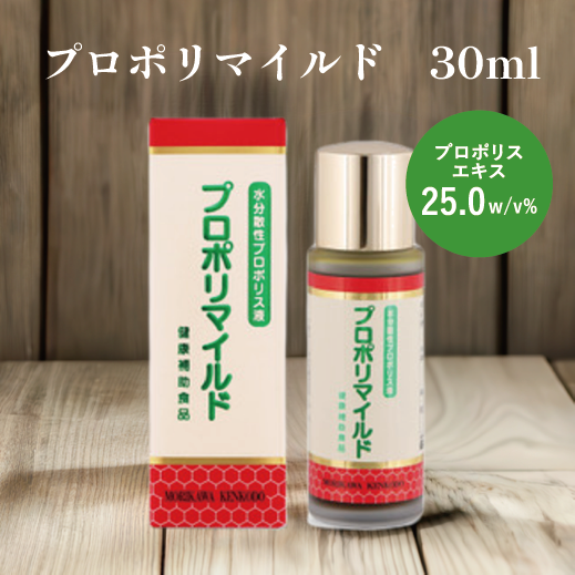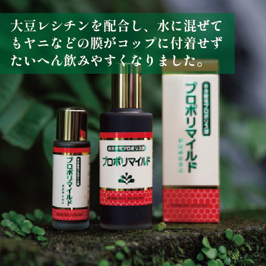「プロポリマイルド」は水に混ぜてもヤニなどの膜がコップに付着せず、たいへん飲みやすくなりました。